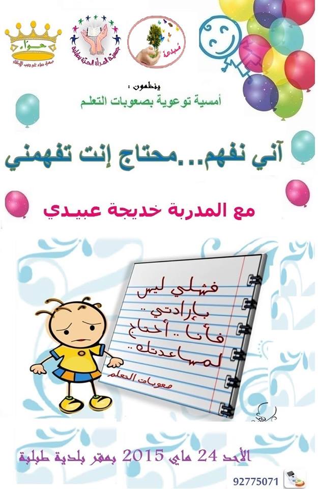 تتشرف جمعية مسلمة مبدعة بالاشتراك مع حمعيتي المراة الحرة و حواء على درب الارتقاء باستدعائكم لامسية بعنوان اني نفهم ….محتاج انت تفهمني حول صعوبات التعلم.