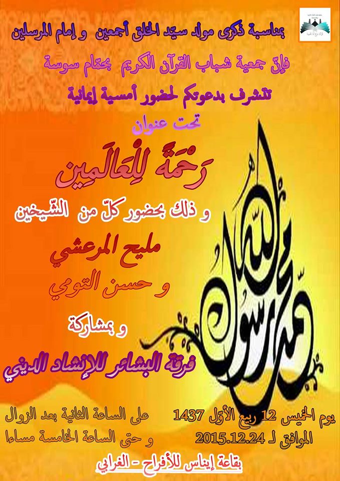 تنظم جمعية شباب القرآن الكريم بحمام سوسة أمسية إيمانية بمناسبة المولد النبوي الشريف بقاعة إيناس للأفراح يوم الخميس 24 ديسمبر 2015 على الساعة الثانية بعد الزوال.
