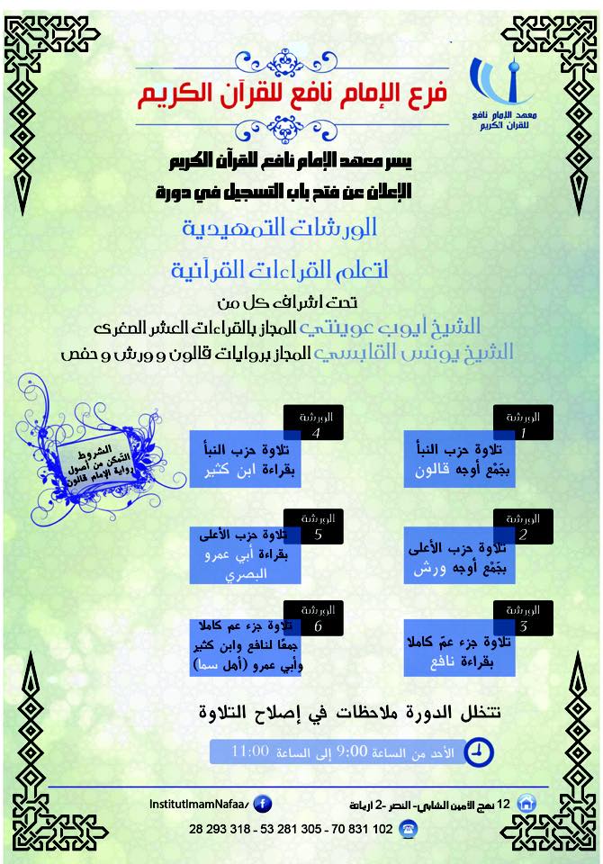 ينظم معهد الامام نافع للقرآن الكريم الورشات التمهيدية للقراءات القرآنية كل يوم أحد من الساعة 9 الى الساعة 11.