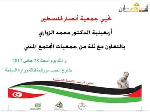 تحي جمعية أنصار فلسطين أربعينية الدكتورالشهيد محمد الزواري بالتعاون مع منتدى فلسطين بجمعية صاحب الطابع و القطب المدني و جمعية الدعوة و الاصلاح وشلك يوم السبت 28 جانفي 2017 بشارع الحبيب بورقيبة ساحة 14جانفي 2011 قبالة وزارة السياحة.