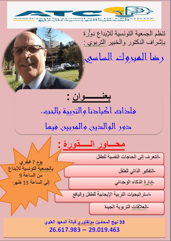 تنظم الجمعية التونسية للابداع دورة تدريبية باشراف الدكتور والخبير التربوي رضا المبروك الساسي تحت عنوان “فلذات اكبادنا والتربية بالحب دور الوالدين والمربين فيها”