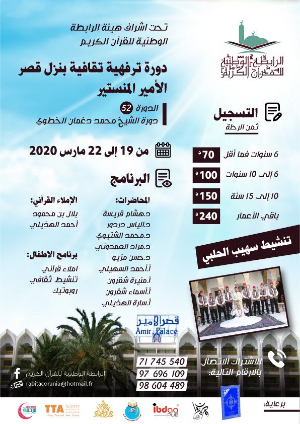 تتشرف الرابطة الوطنية للقرءان الكريم بدعوة الحفاظ والحافظات لكامل القرءان الكريم وجميع منخرطيها وطلبتها والهيئات المديرة للفروع الجهوية والمحلية للمشاركة في الدورة 52 دورة الشيخ محمد دغمان الخطوي حسب الاعلانات الصادرة .