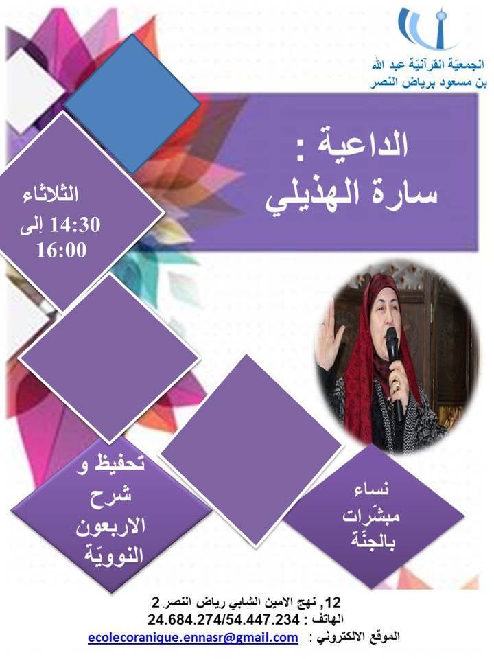 تعلن الجمعية القرآنية عبد الله ابن مسعود عن إنطلاق دورة في شرح الاربعين نووية في حي النصر إبتداء من يوم الثلاثاء 19 جانفي 2021 مع الشيخة و الداعية سارة الهذيلي.