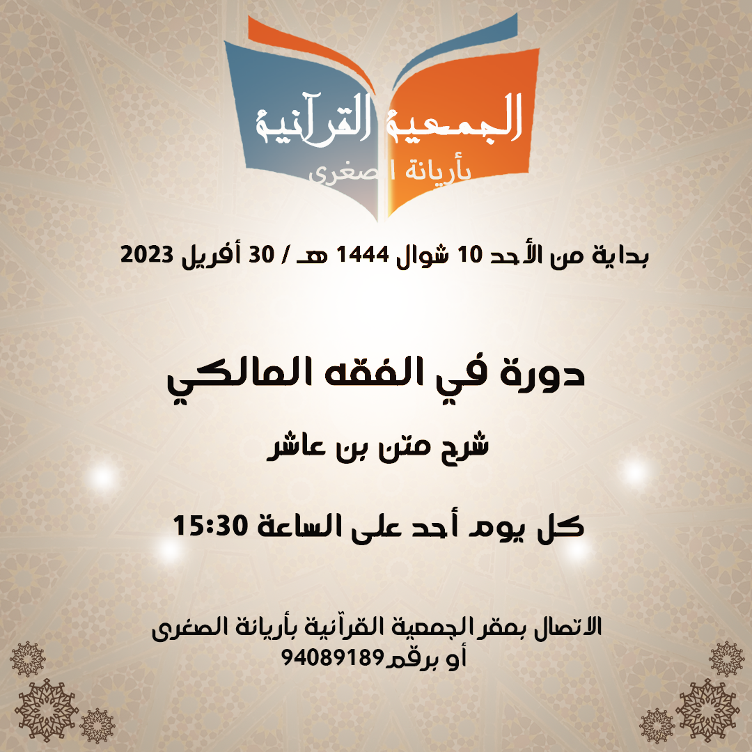 تنظم الجمعية القرآنية بأريانة الصغرى دورة خاصة للرجال في شرح متن بن عاشر في الفقه المالكي. شارك هذا الموضوع: المشاركة على X (فتح في نافذة جديدة) X شارك على فيس بوك (فتح في نافذة جديدة) فيس بوك معجب بهذه:إعجاب تحميل... تصفّح المقالات دورة سورة النساء بالدنداندرس أسبوعي في الفقه المالكي بالمنيهلة
