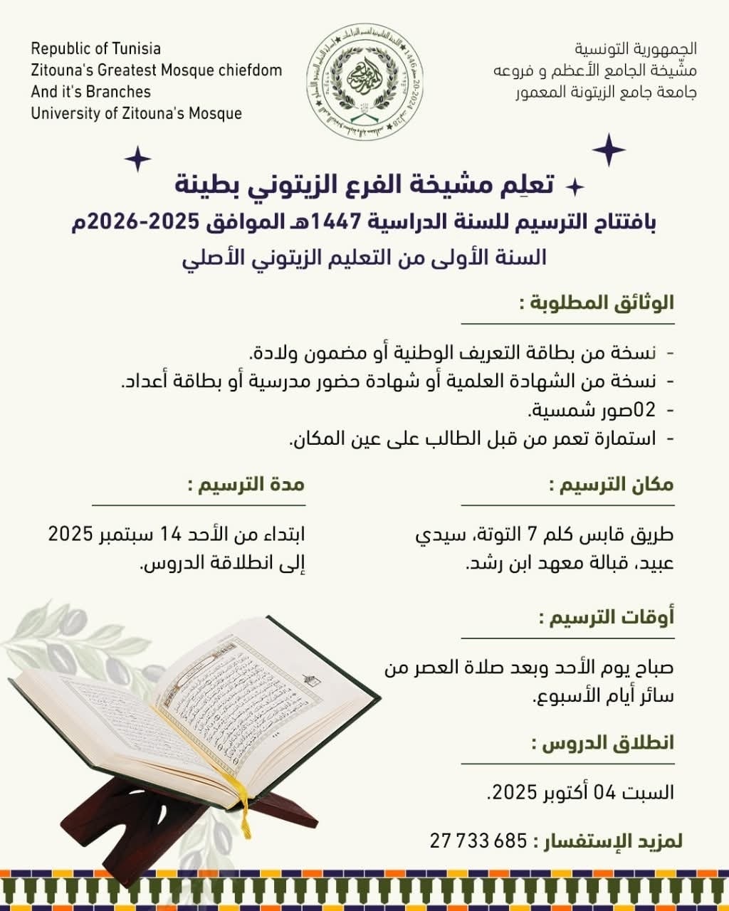 شارك هذا الموضوع: المشاركة على X (فتح في نافذة جديدة) X شارك على فيس بوك (فتح في نافذة جديدة) فيس بوك معجب بهذه:إعجاب تحميل... تصفّح المقالات فتح باب التسجيل بالجمعية التونسية للعلوم الشرعية مركز المرسىدروس في فقه السيرة النبوية بحي النصر
