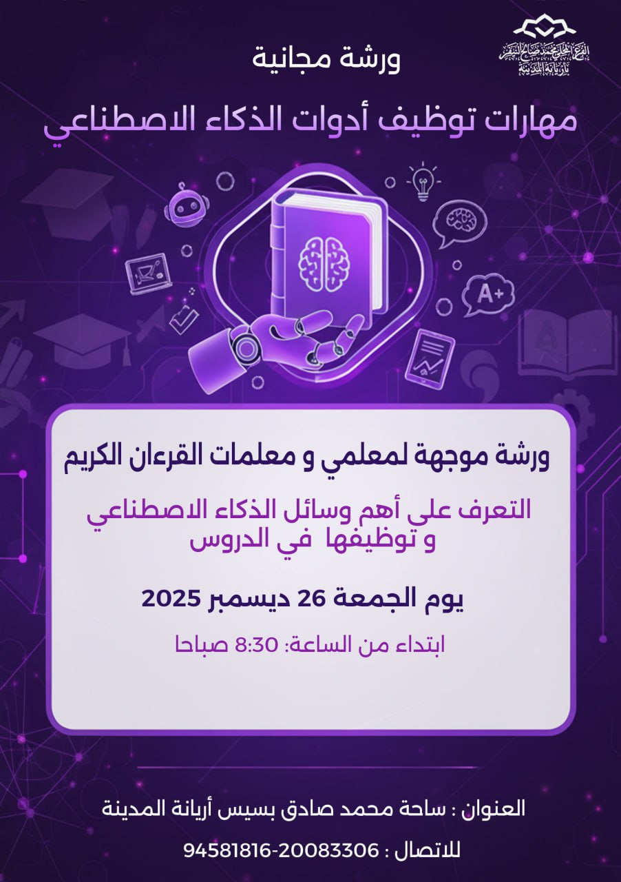 ينظم الفرع المحلي محمد صالح النيفر ورشة: “استخدام الذكاء الاصطناعي في التعليم” يوم الجمعة 26 ديسمبر 2025 ابتداء من الساعة 8:30 صباحا .
