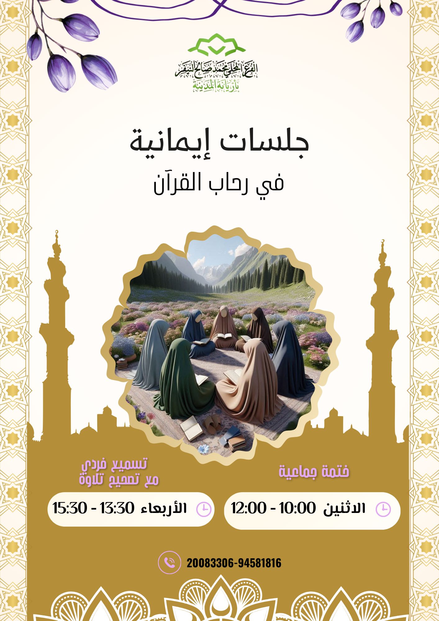 تنظم جمعية المحافظة على القرآن الكريم بأريانة الفرع المحلي محمد صالح النيفر جلسات ايمانية في رحاب القرآن للنساء : ختمة جماعية مع تدبّر وتصحيح تلاوة كل يوم اثنين من 10-12:00 ابتداء من يوم 1 ديسمبر 2025 بمقر الجمعية : ساحة محمد الصادق بسيس أريانة المدينة قرب الجامع الكبير.