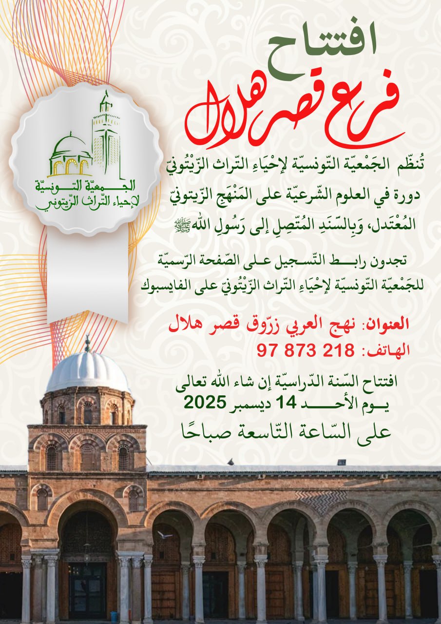 رابط التسجيل في كل الفروع داخل تونس وخارجها: https://forms.gle/B4y1kxfKZp8TBcfy9 شارك هذا الموضوع: النقر للمشاركة على X (فتح في نافذة جديدة) X انقر للمشاركة على فيسبوك (فتح في نافذة جديدة) فيس بوك معجب بهذه:إعجاب تحميل... تصفّح المقالات دورة حفظ وتدبّر سورة لقمان بالعاصمةافتتاح فرعِ الجمعية التونسية لإحياء التراث الزيتوني بمدنين