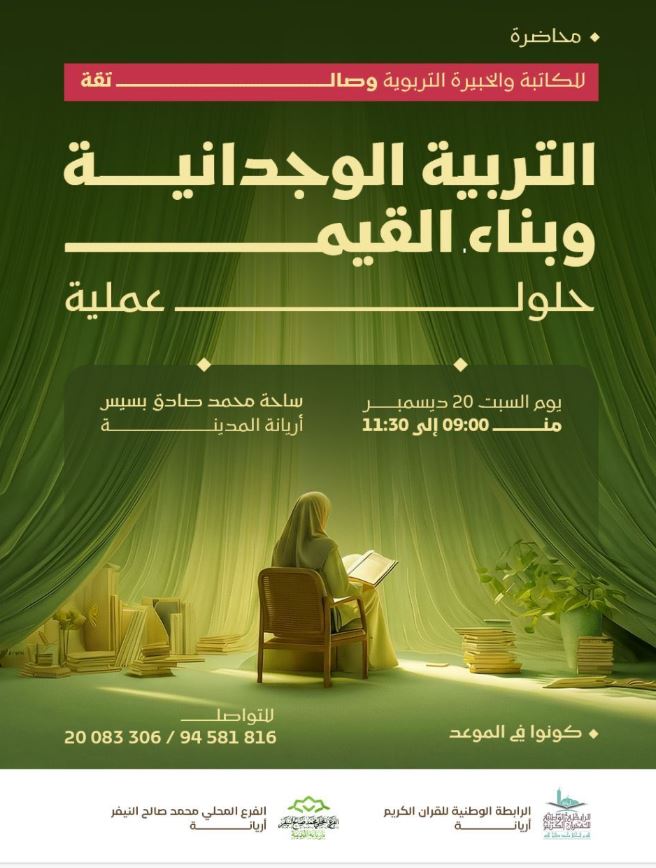 يسرّ الفرع المحلي محمد صالح النيفر دعوتكم إلى محاضرة بعنوان : «التربية الوجدانية وبناء القِيم – حلول عمليّة» يوم السبت 20 ديسمبر من 09:00-11:30 .