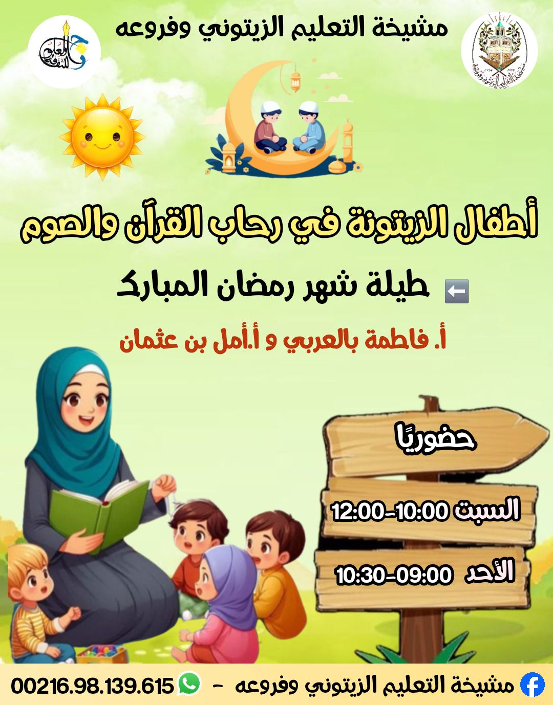 تعلن مشيخة التعليم الزيتوني وفروعه عن انطلاق التسجيل في دورة أطفال الزيتونة في رحاب القرآن والصوم : برنامج تربوي رمضاني يجمع بين حفظ القرآن وتعلم فقه الصيام في أجواء إيمانية ممتعة للأطفال من 8 سنوات فما فوق حضوريًا بمقر المشيخة نهج قليبية باب الخضراء تونس عدد 6 .