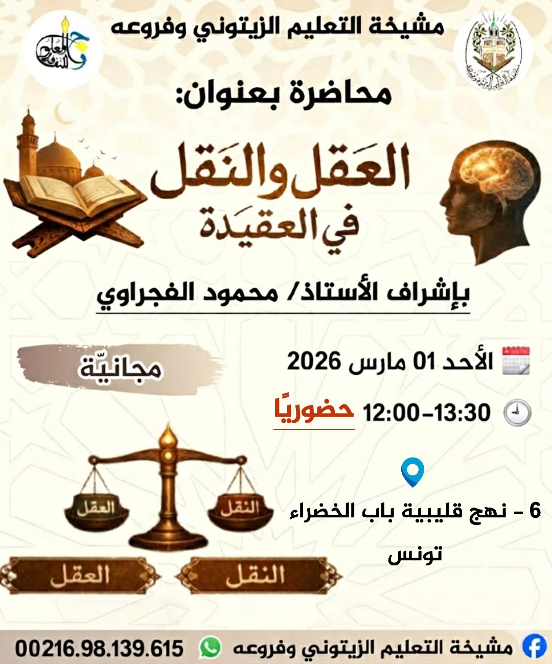 تتشرف مشيخة التعليم الزيتوني وفروعه بدعوتكم لحضور محاضرة علمية بعنوان: العلاقة بين العقل والنقل في العقيدة يقدّمها الأستاذ الفاضل محمود الفجراوي وذلك حضورياً بمقر المشيخة الكائن بـ:6 نهج قليبية، باب الخضراء، تونس يوم الأحد غرة مارس 2026 من الساعة 12:00 إلى الساعة 13:30 .