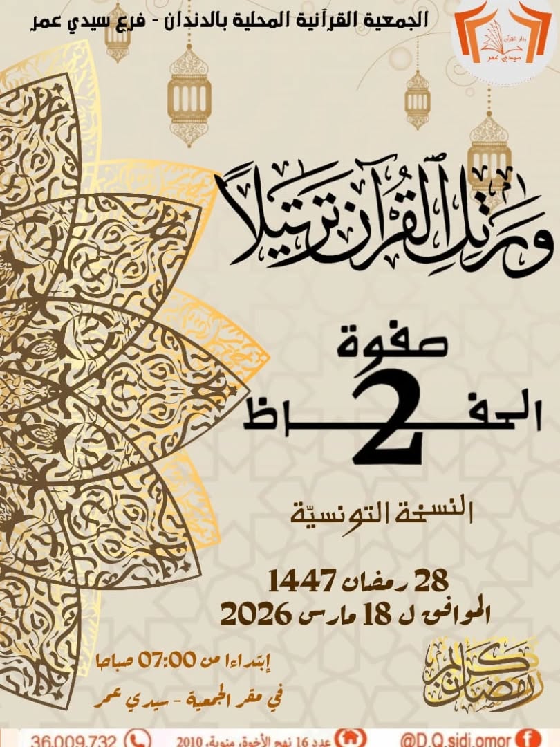 في رحاب شهر القرآن، شهر التلاوة والإتقان، ووفاءً لنهج قرّائنا المرابطين في غزة ، تعلن الجمعية القرآنية المحلية بالدندان – فرع سيدي عمر عن انطلاق الدورة الثانية من: اليوم القرآني: صفوة الحفّاظ – النسخة التونسية موعدٌ متجدد مع أهل القرآن، نفتح فيه الأبواب لأبنائنا الحفّاظ لتسميع محفوظهم ضمن المستويات التالية:
