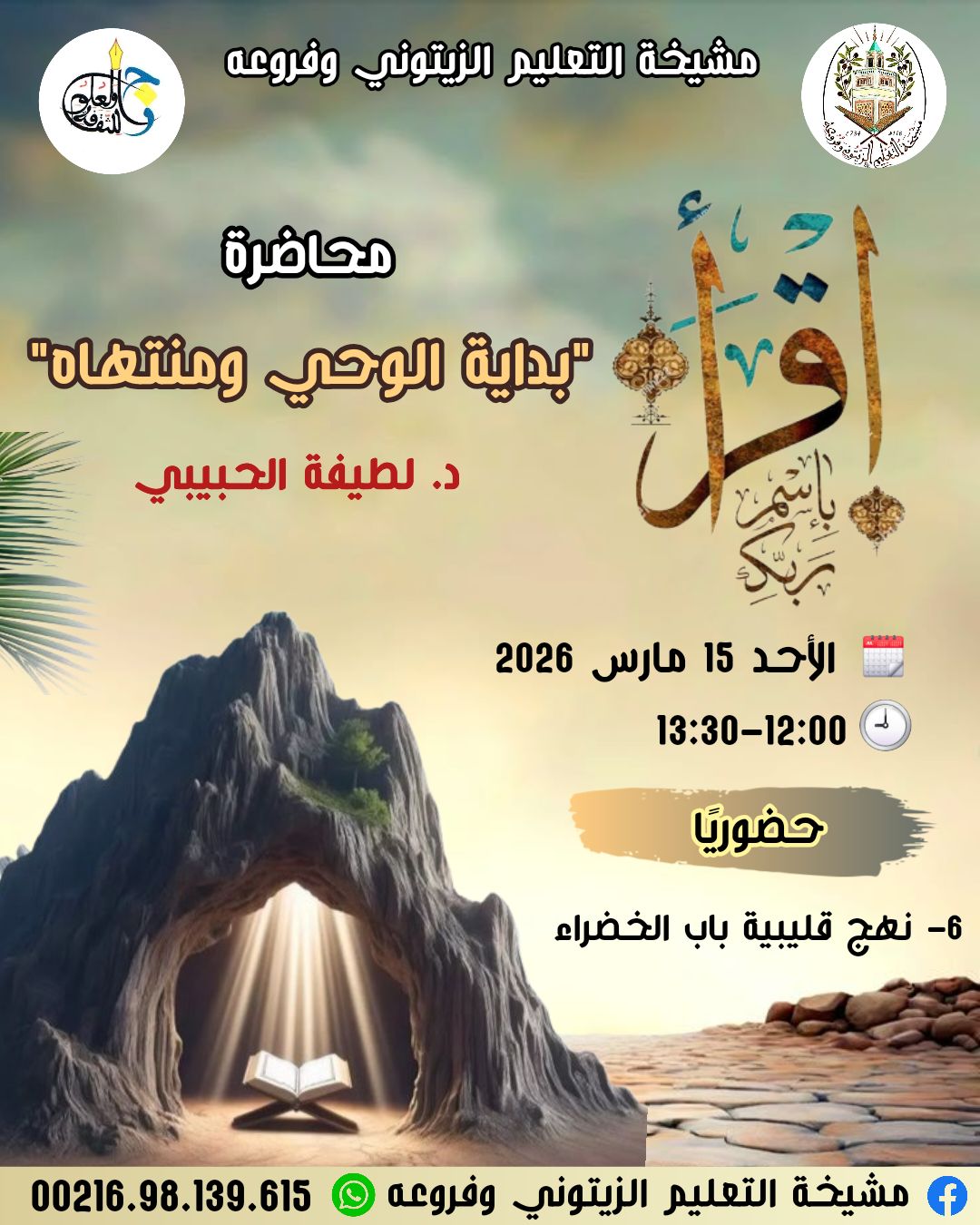 تتشرف مشيخة التعليم الزيتوني وفروعه بدعوتكم لحضور محاضرة بعنوان: «اقرأ: بداية الوحي ومنتهاه» بإشراف الدكتورة لطيفة الحبيبي يوم الأحد 15 مارس 2026 على الساعة 12:00 ظهرًا حضورياً بمقر المشيخة نهج قليبية باب الخضراء تونس.
