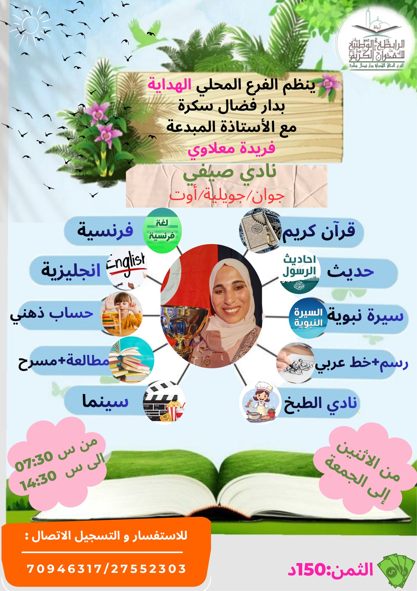 يعلن الفرع المحلي الهداية بدار فضال سكرة اريانة على انطلاق التسجيل بالنادي الصيفي المميز للأطفال لسنة 2025-2026،