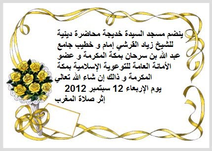 ينظم مسجد السيّدة خديجة – الصفايا سوسة محاضرة دينية للشيخ زياد القرشي إمام و خطيب جامع عبد الله بن سرحان بمكة المكرمة و عضو الأمانة العامة للتوعوية الإسلامية بمكة المكرمة و ذالك إن شاء الله تعالي يوم الإربعاء 12 سبتمبر 2012 إثر صلاة المغرب