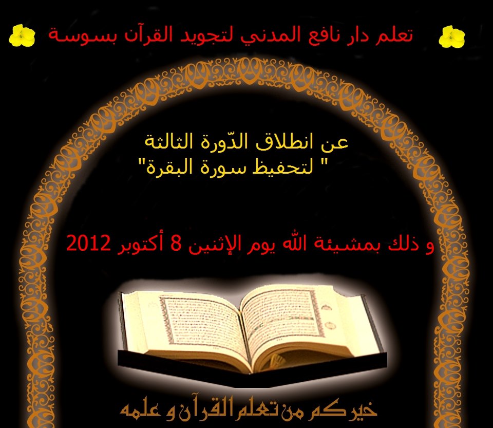 تعلم دار نافع المدني لتجويد القرآن بسوسة عن انطلاق الدورة الثالثة لتحفيظ سورة البقرة و ذلك بإذن الله يوم الإثنين 8 أكتوبر 2012