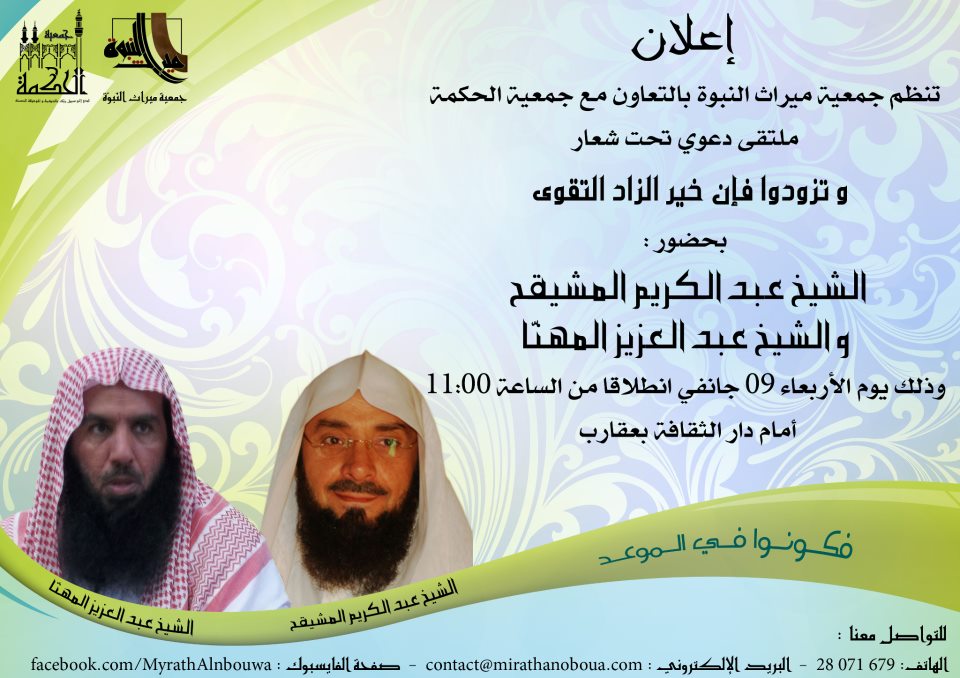 تنظم جمعية ميراث النبوة بالتعاون مع جمعية الحكمة ملتقى دعوي تحت شعار و تزودوا فإنّ خير الزّاد التقوى بحضور : الشيخ عبد الكريم المشيقح و الشيخ عبد العزيز المهنّا وذلك يوم الأربعاء 09 جانفي انطلاقا من الساعة 11:00 أمام دار الثقافة بعقارب .