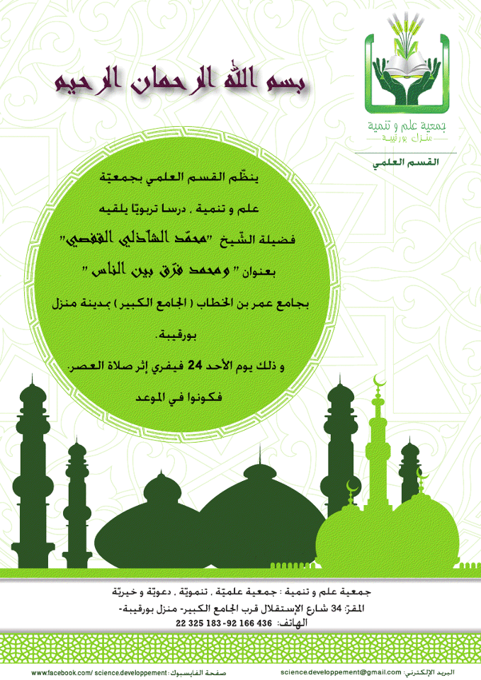 محاضرة الشيخ محمد القفصي بمنزل بورقيبة يوم الأحد 24 فيفري 2013 بعد صلاة العصر. شارك هذا الموضوع: المشاركة على X (فتح في نافذة جديدة) X شارك على فيس بوك (فتح في نافذة جديدة) فيس بوك معجب بهذه:إعجاب تحميل... تصفّح المقالات وزارة الشؤون الدّينيّة : فتح باب الترشح للمشاركة في مسابقات قرآنيةأمسية فكرية : منهجيات الحوار