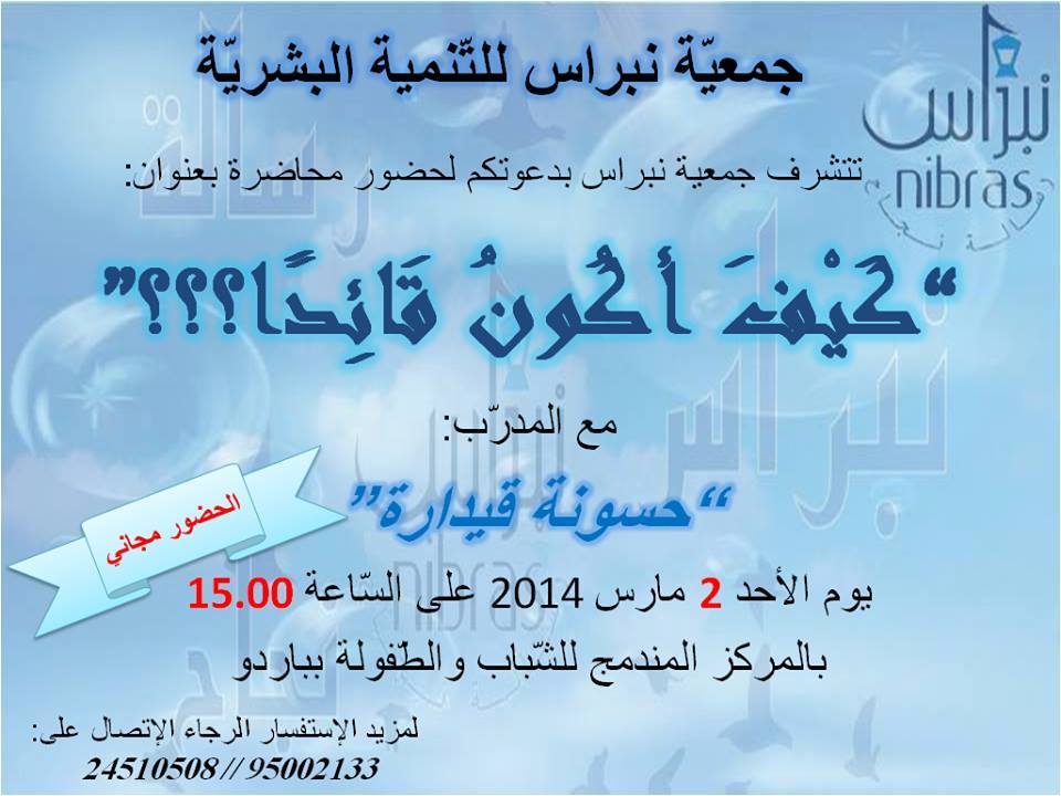 تنظم جمعية نبراس للتنمية البشرية محاضرة : كيف أكون قائدا؟ يوم الأحد 2 مارس على الساعة 15:00 بعد الزوال بالمركز المندمج للشباب و الطفولة بباردو
