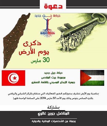 احياء لذكرى يوم الارض، أرض فلسطين، أرضنا المغتصبة بقوة السلاح والصهيونية والاستعمار والخيانات. وتواصلا مع تراث المقاومة وتاريخ الكفاح المسلح من اجل التحرير والوحدة وتجسيما لتواصل النضال وتجذير القضية الفلسطينية في وجدان وعقول الأجيال كافة. نتشرف بدعوتكم لحضور الفعاليات التي ستقام بالمركب الشبابي و الرياضي بالمنزه السادس بتونس و ذلك يوم الأحد 30 مارس 2014 على الساعة الواحدة ظهرا بمشاركة المناضل جورج غلاوي، و جملة من الشخصيات الوطنية و الدولية.