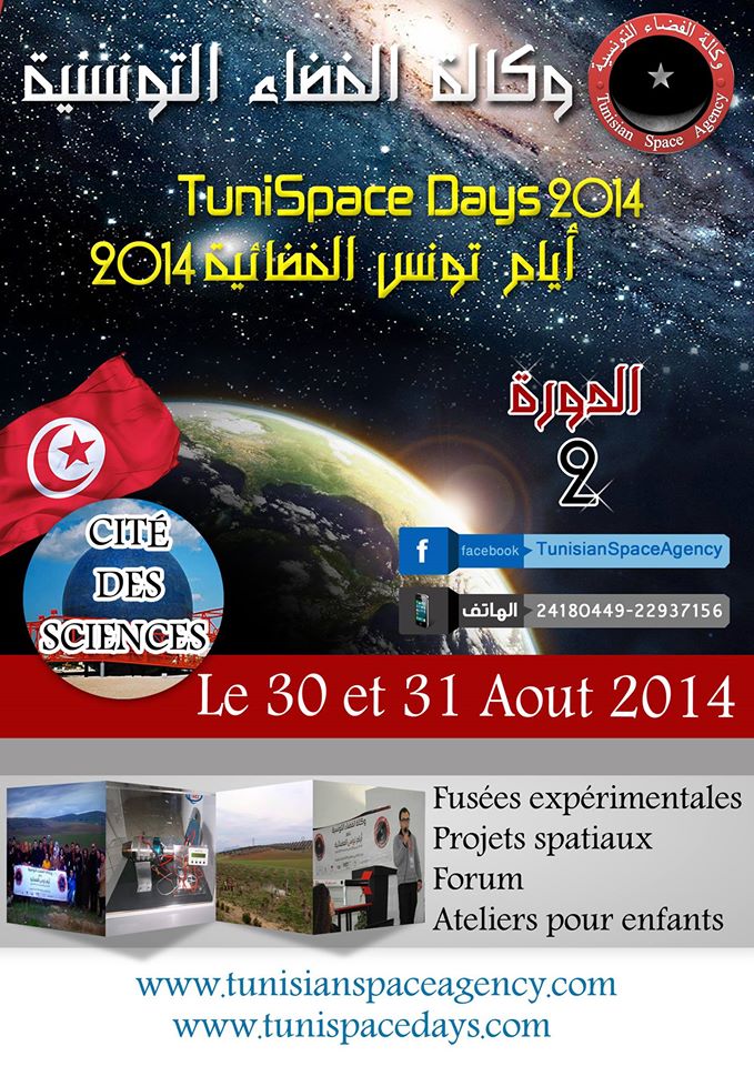 تنظم جمعية وكالة الفضاء التونسية أيام تونس الفضائية 2014 يوم 30 أوت 2014 بمدينة العلوم بتونس. شارك هذا الموضوع: المشاركة على X (فتح في نافذة جديدة) X شارك على فيس بوك (فتح في نافذة جديدة) فيس بوك معجب بهذه:إعجاب تحميل... تصفّح المقالات بيان الحملة التونسية لإغاثة غزة بالأدوية والمواد الطبيةالانضمام الى مشروع الشفيع لتحفيظ القرآن الكريم