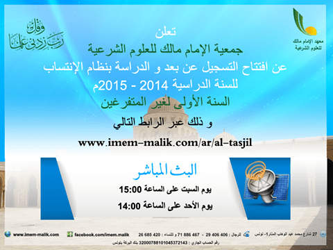 تعلن جمعية الإمام مالك للعلوم الشرعية عن افتتاح التسجيل عن بعد و الدراسة بنظام الإنتساب للسنة الدراسية 2014 – 2015م السنة الأولى لغير المتفرغين.