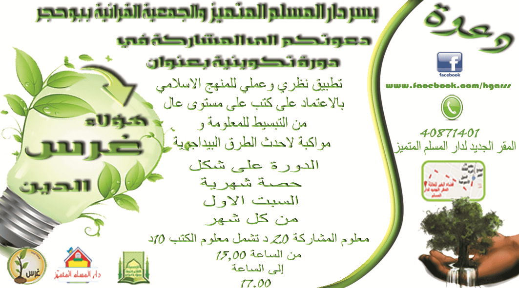 يسر دار المسلم المتميز و الجمعية القرآنية ببوحجر دعوتكم لحضور دورة تكوينية تحت عنوان :”هؤلاء غرس الدين” بفضاء الخير للعائلة ببوحجر ابتداءا من يوم السبت القادم الموافق ل 1 نوفمبر 2014